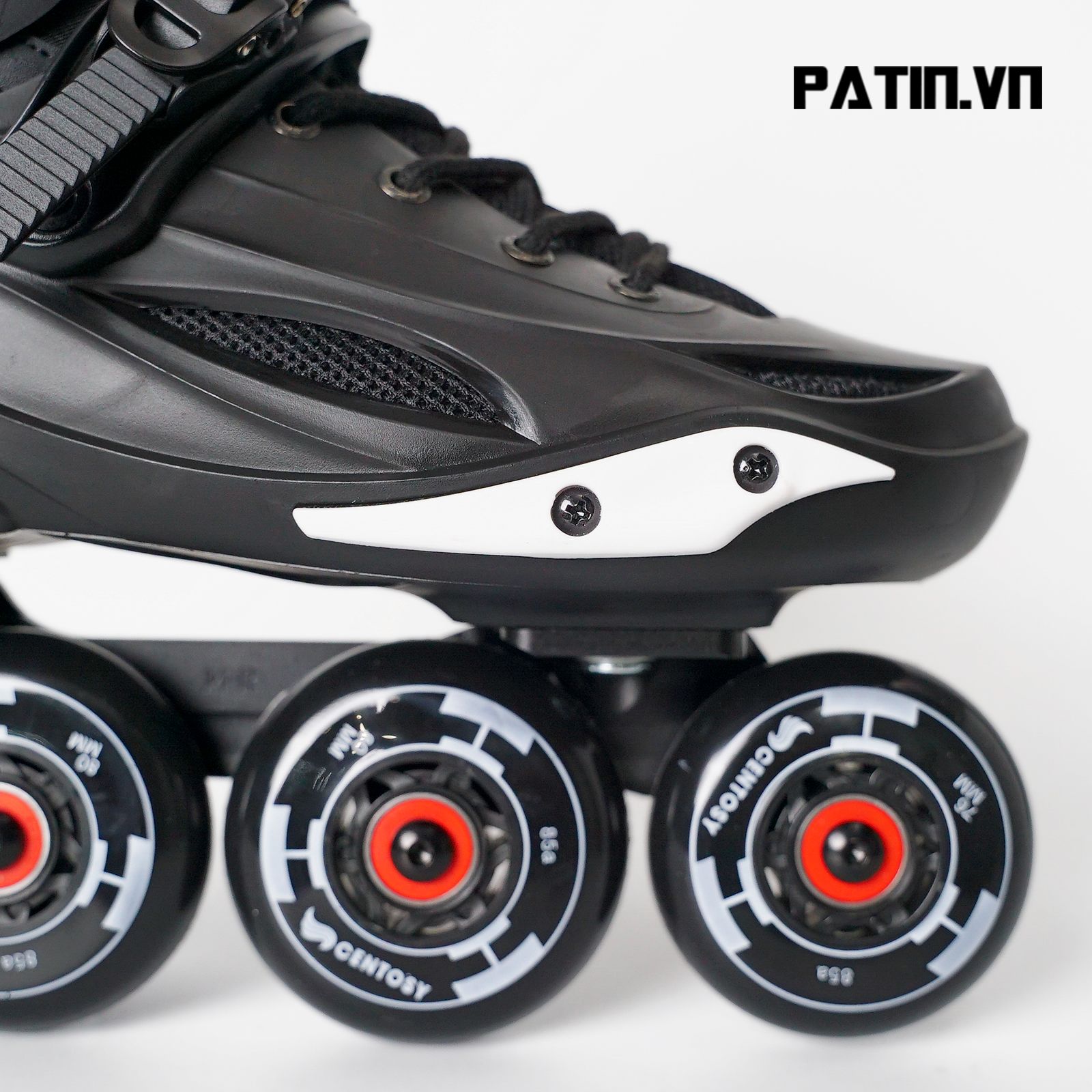 – Bánh xe: Sử dụng vật liệu cao su đặc bền bỉ dẻo dai, có tính kháng dầu, chống trầy xước , chống xé rách, và chịu được mài mòn tốt. Đường kính bánh xe từ 72-80mm tùy theo size giày. Tháo lắp dễ dàng khi cần thay thế.