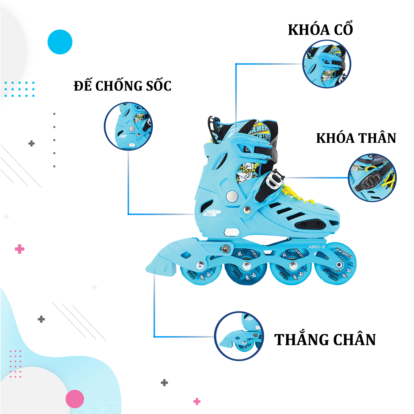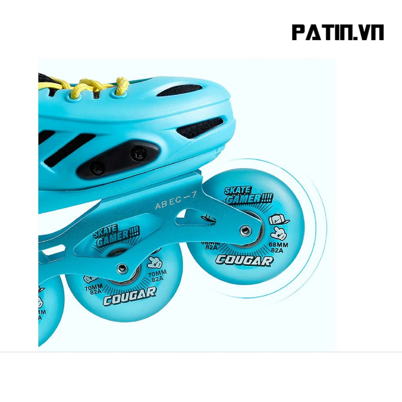– Bánh giày: Được làm từ chất liệu nhựa PU có độ đàn hồi, bám đường, chống mài mòn tốt, 4 bánh mỗi bên giày có đèn led phát sáng tạo sự thu hút cho các bé khi chơi đặc biệt vào buổi tối, độ cứng 82A.