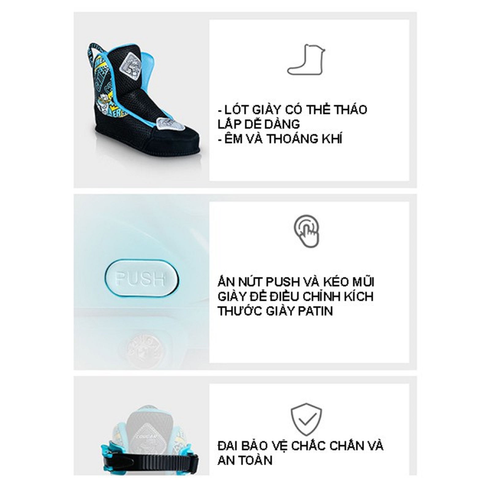– Boot giày: Được làm từ vải đàn hồi kết hợp với hệ thống vải lưới khí tạo sự thông thoáng mang lại cảm giác thoải mái và không bị bí chân cho người dùng. Tháo lắp, vệ sinh dễ dàng sau khi sử dụng.